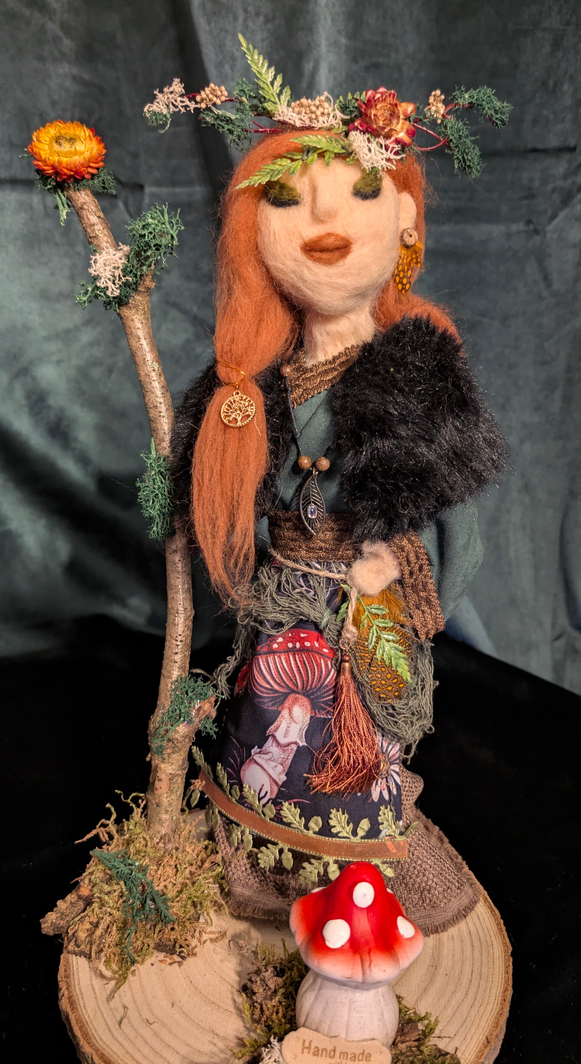 Seelenfigur: Wald Schamanin ,handgefilzt. Auf einer Baumscheibe.